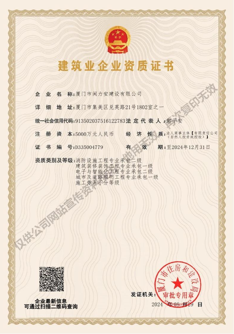 廈門市閩力安建設(shè)有限公司成立于2003年,公司取得市政公用工程施工總承包貳級、建筑裝修裝飾工程專業(yè)承包壹級、城市及道路照明工程專業(yè)承包壹級、電子與智能化工程專業(yè)承包貳級、消防設(shè)施工程專業(yè)承包貳級、電力工程施工總承包叁級、建筑機(jī)電安裝工程專業(yè)承包叁級、輸變電工程專業(yè)承包叁級、環(huán)保工程專業(yè)承包叁級、照明工程設(shè)計(jì)專項(xiàng)甲級、建筑裝飾工程設(shè)計(jì)乙級、施工勞務(wù)等資質(zhì)的綜合型企業(yè),公司于2013年通過了ISO9001質(zhì)量體系認(rèn)證,ISO14001環(huán)境管理體系認(rèn)證,OHSAS18001職業(yè)健康安全管理體系認(rèn)證。